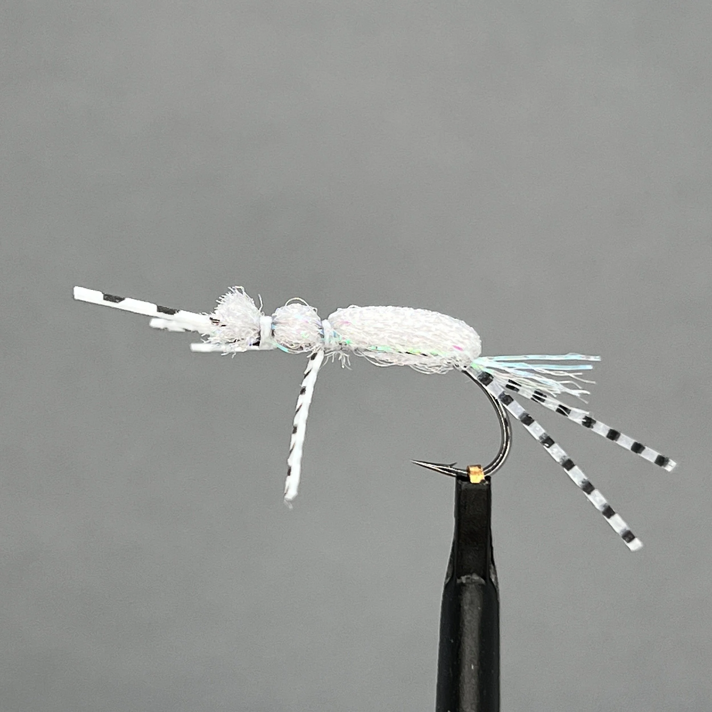 ABDOMEN: Pheasant tail (capped over gills) Gills: Palmered natural light grey Ostrich (fine strands, like cut from a from feather duster.) THORAX: Contrast to abdomen with died darker brown (or olive) Ostrich [black, dubbed, or even traditional peacock herl thoraxes) WINGCASE: Thin strand of pearlescent or UV transparent shell back material like: “Ice blue pearl tinsel,” or strands of crystal flash, or etc..), over Pheasant tail shell